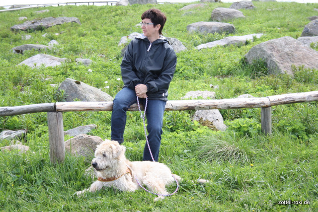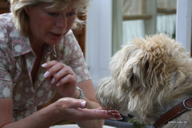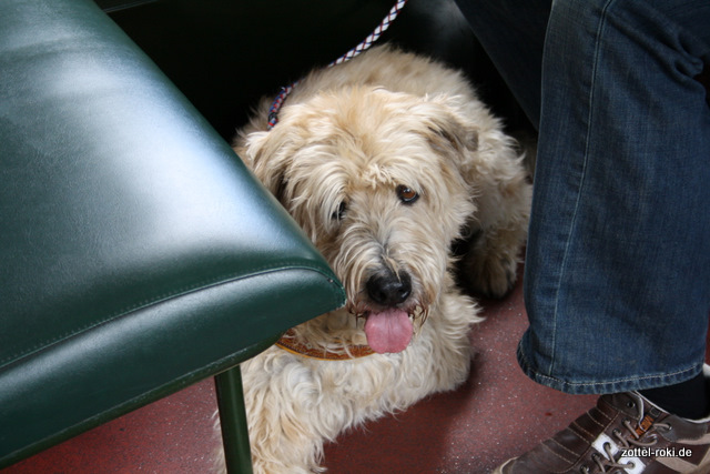 Also Roki war ganz lieb, wie nicht anders zu erwarten war, aber vor uns saß dann eine Dame mit einem Dutt. Und der wurde mit einem schönen schwarzen Band gehalten das zu rufen schien: “Schnapp mich doch, altes Loch !” – Frauchen war nicht amüsiert und deshalb gab es zwei Ermahnungen und dann guckst Du so: