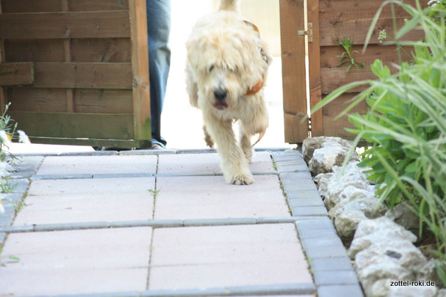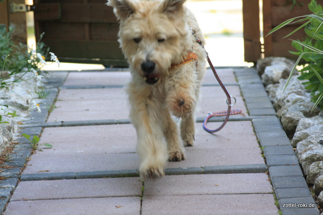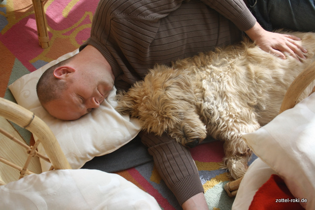 Herr Roki und seine Leinenhalter, die vom Schreiben des letztes Absatzes eine Pfütze auf der Zunge haben