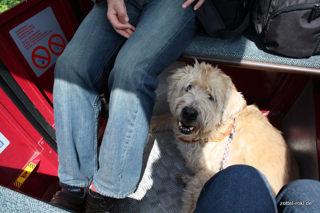 Und raus ging es genau so schnell wie rein, ganz souverän und ohne Panik oder Stress: einfach ‘hüpf’. Die ganze Prozedur ist auch für ältere Hunde kein Problem, die Bahn fährt sehr langsam und es schaukelt auch nicht. Cooler Blick, oder?