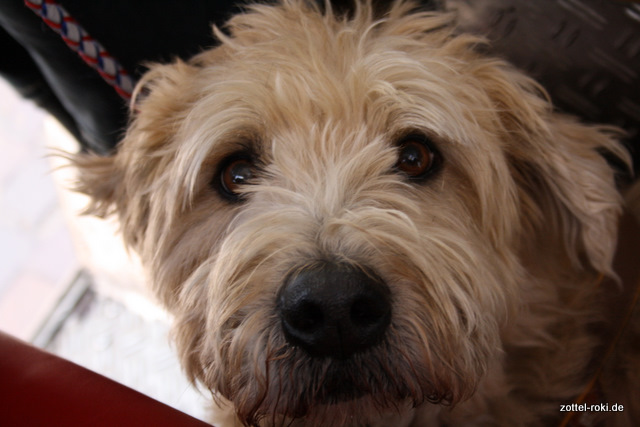 Also Roki war ganz lieb, wie nicht anders zu erwarten war, aber vor uns saß dann eine Dame mit einem Dutt. Und der wurde mit einem schönen schwarzen Band gehalten das zu rufen schien: “Schnapp mich doch, altes Loch !” – Frauchen war nicht amüsiert und deshalb gab es zwei Ermahnungen und dann guckst Du so: