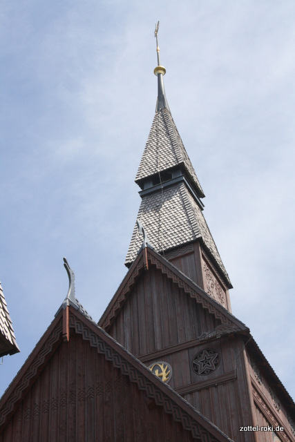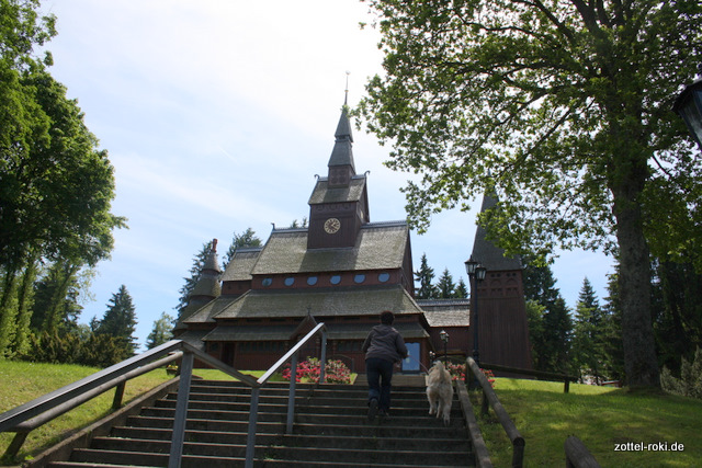 Also waren wir in Hahnenklee, um dort die Stabholzkirche zu besichtigen. Es war ja Donnerstag, wenig Leute unterwegs und noch recht früh am Tag, so konnte Roki entspannt ein Stück laufen und im Schatten der Bäume auf der Wiese abhängen – dachten wir. Nee, das ging natürlich nicht so, weil wir ja getrennt zur Besichtigung in die Kirche mussten. Also hat Roki sein Programm je nach Abwesenheit eines Leinenhalters eingerichtet: “Hechel-hechel-hechel In der Sonne stehend, quietsch – Frauchen/Herrchen ! Ich will mit rein ! Hechel-hechel-hechel, quietsch, quietsch…”
