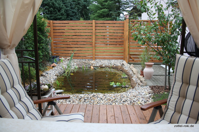 Unser “Garten-Ozean” wächst und gedeiht, jeden Tag ein bissel mehr. Es war höchst erstaunlich wie schnell sich Käfer und vor allem die Algen einfanden. In der Startphase lief der Filter noch nicht und die Sonne schien voller Kraft in eine pflanzenlose Pfütze. Ein paar Tage zuvor hatten wir schon mal ein paar Bilder gezeigt… Die Fadenalgen sind schneller gewachsen als ich das Wort am PC schreiben kann – zumindest kam es mir so vor. Dagegen haben wir jetzt stinknormalen Torf in Jutesäcke gepackt und mit einem Stein ins Wasser versenkt.