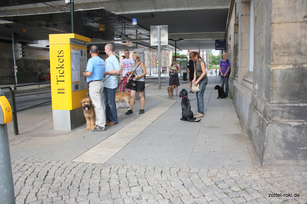 Los ging es mit der Straßenbahn vom Bahnhof Mitte in Dresden mit der “10” zum Postplatz. Herrchen konnte den Automaten wieder nicht bedienen und brauchte einen Berater, so dass wir vor Anbruch der Nacht noch losfahren konnten.