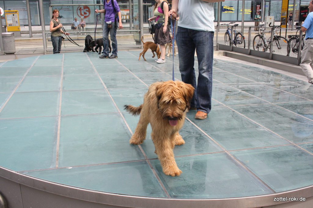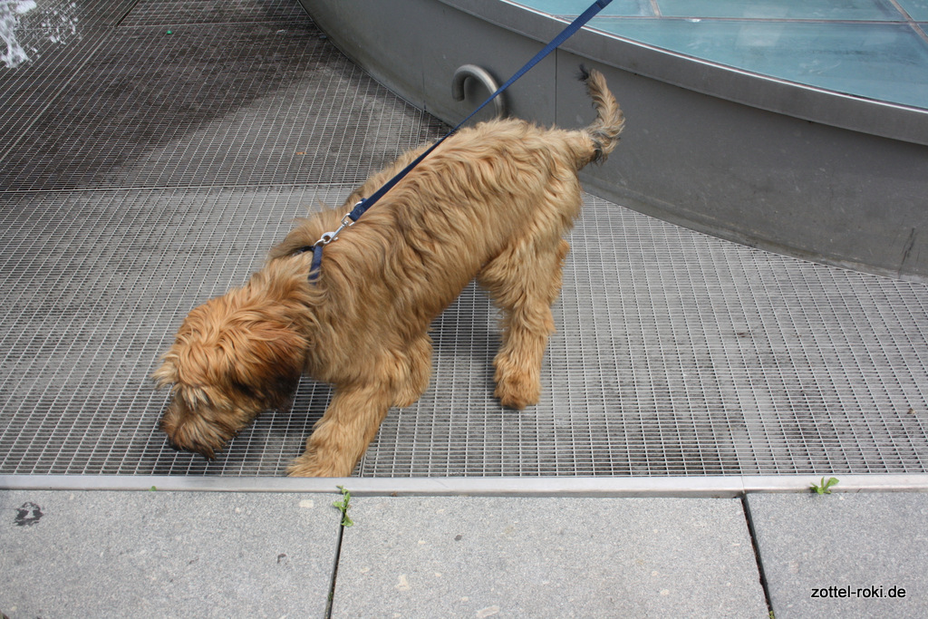 Als wir aus dem Bahnhof raus waren gab es noch eine “Mutprobe”: Einmal über das Gitterrost der Tiefgarage und dann über den Lichthof – da ist es ganz schön tief (ca. 15m tief) – aber wass soll’s, für Frauchen mache ich das gerne. ![]()